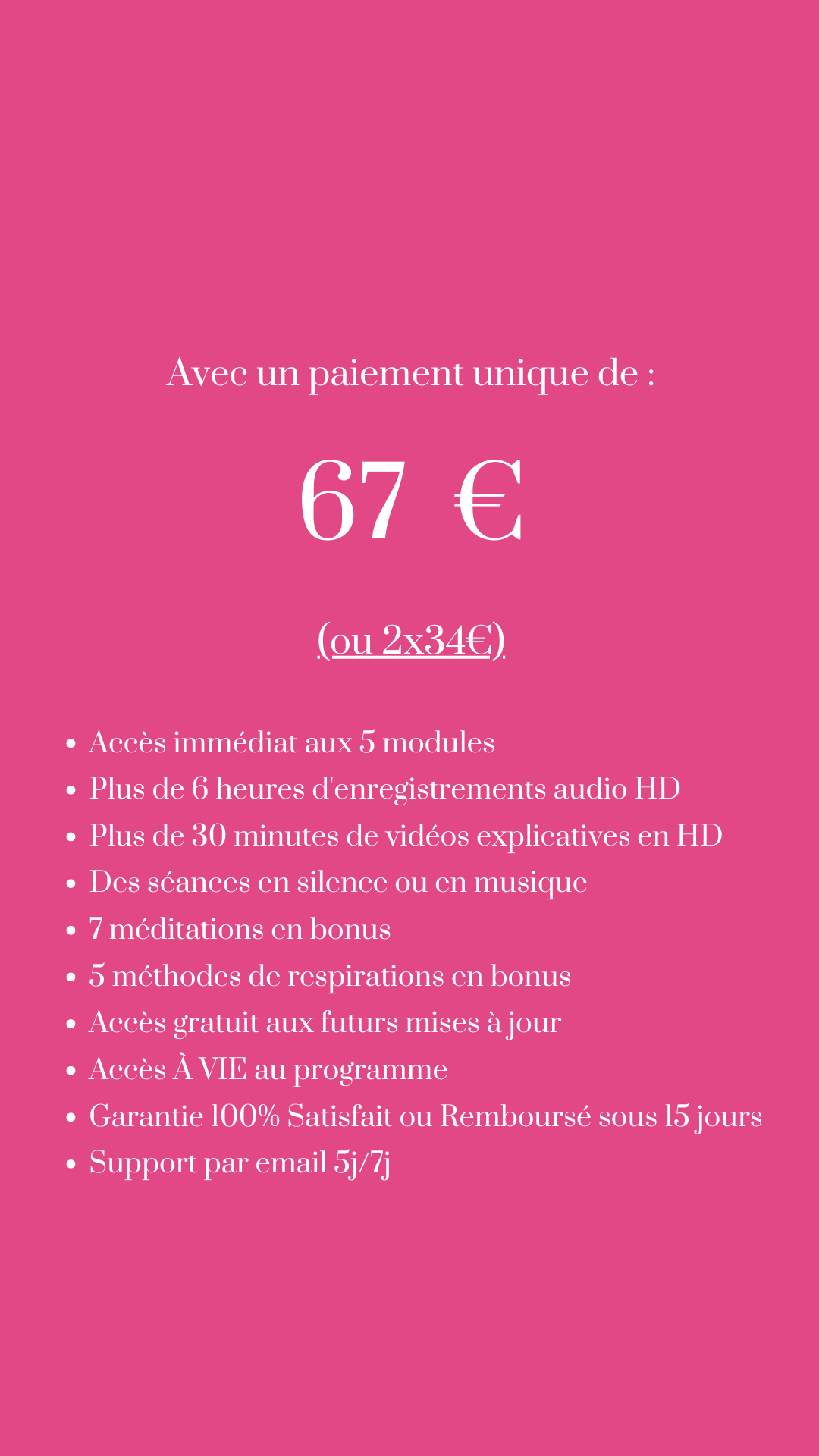 Comme le fait d'être à l'écoute de soi, de savoir utiliser le stress au moment où tu en as réellement besoin, de créer un ancrage adapté à ton profil pour enfin maîtriser le stress au moment cruciaux de ta vie.